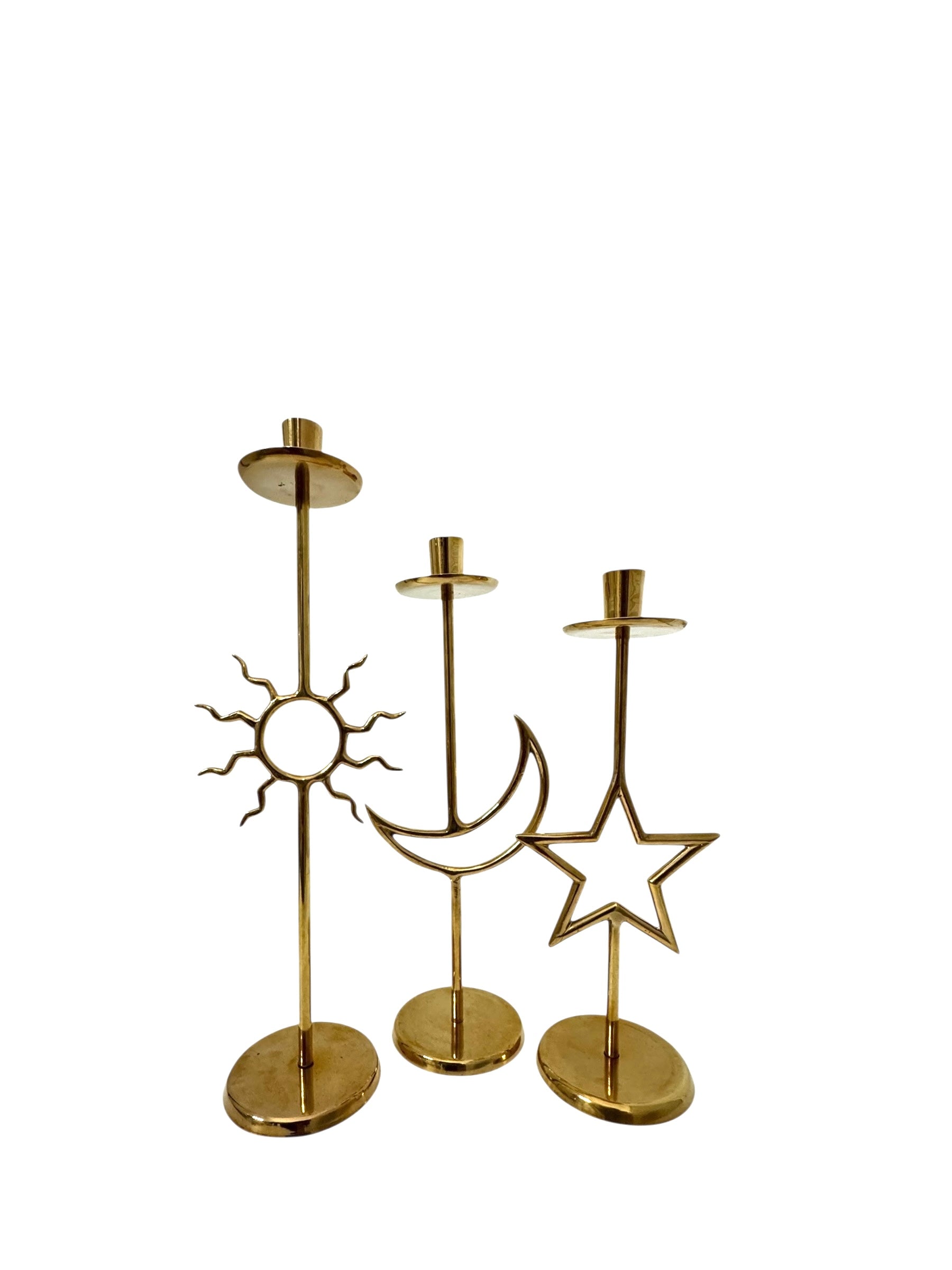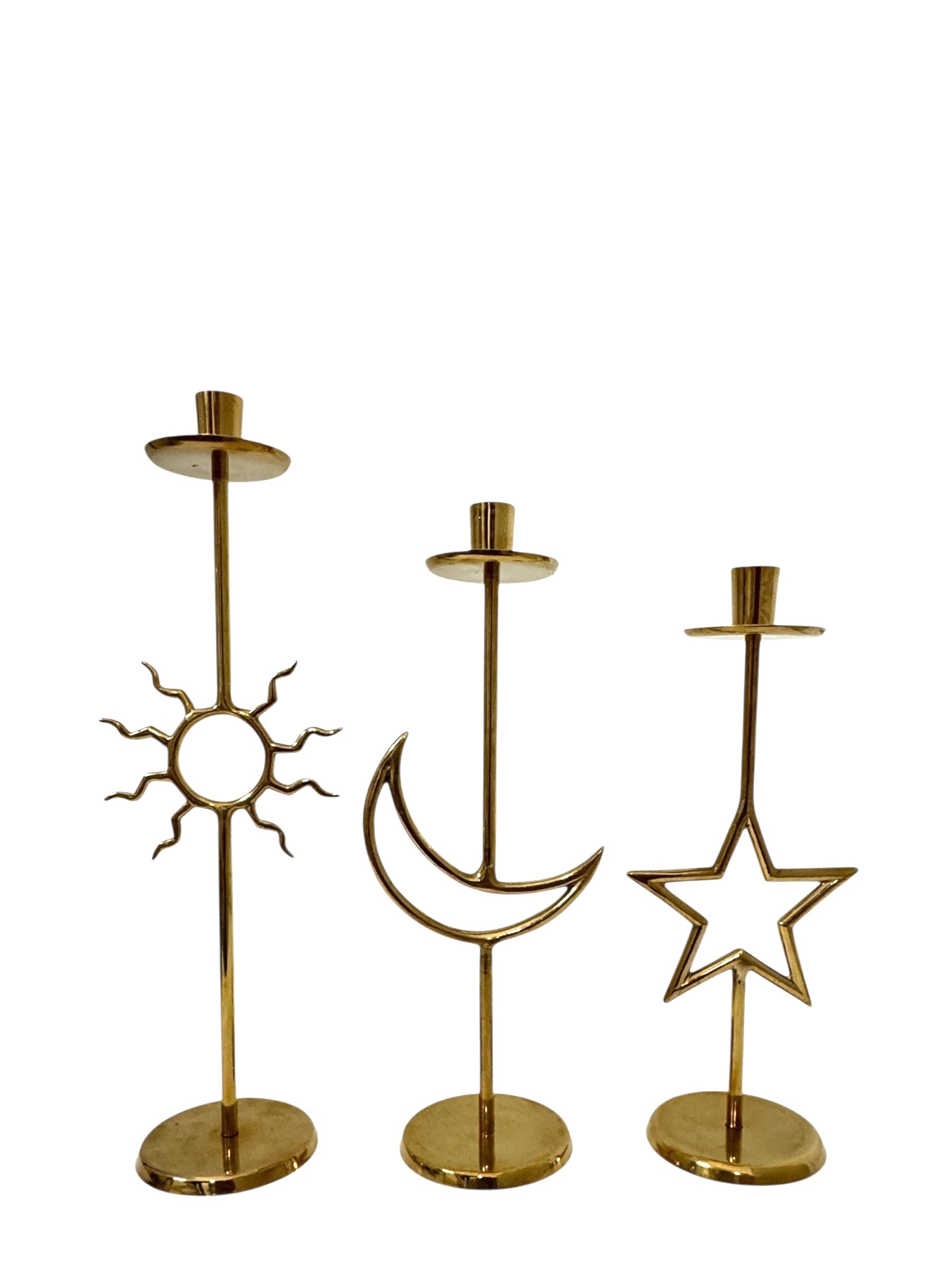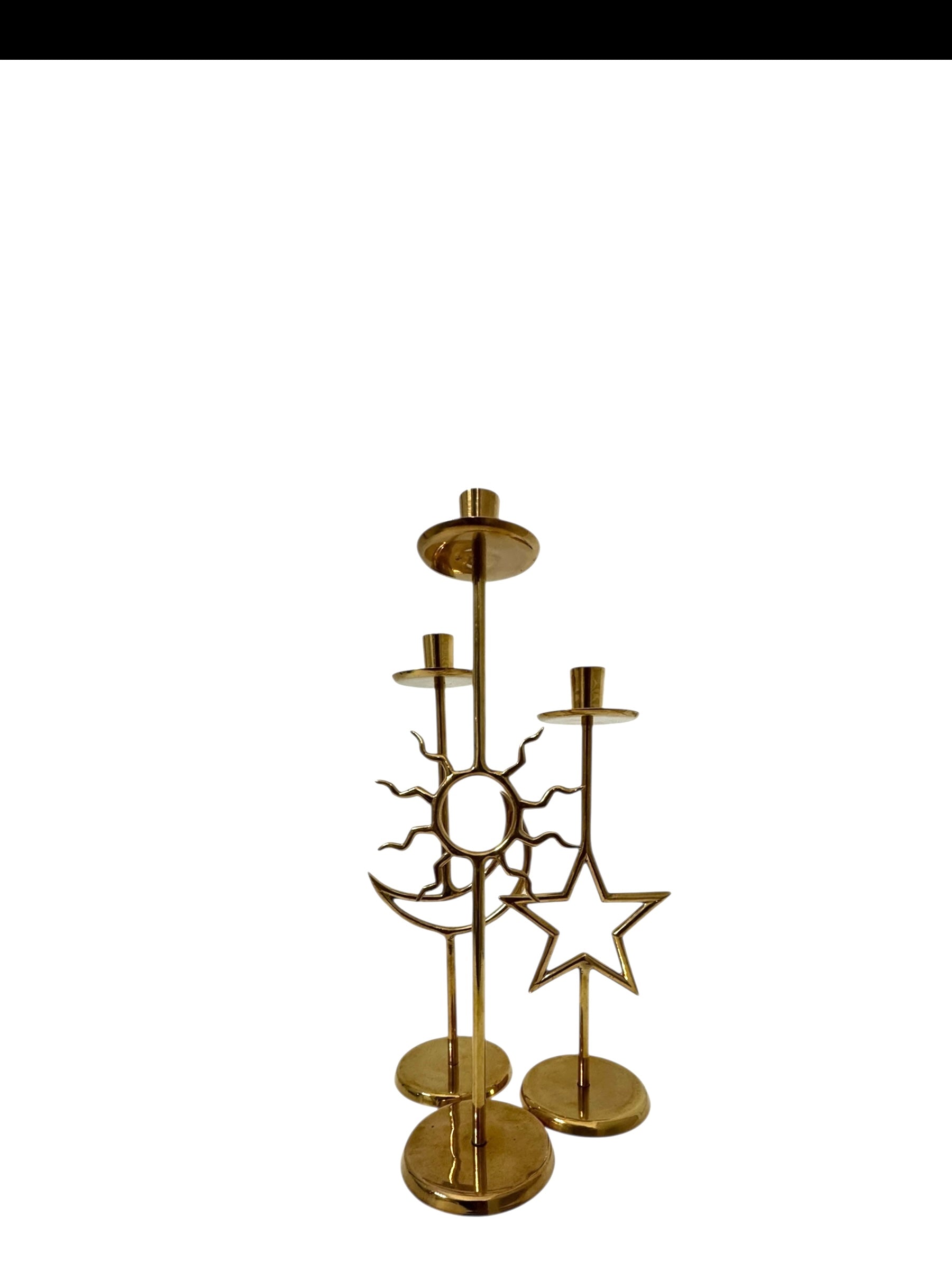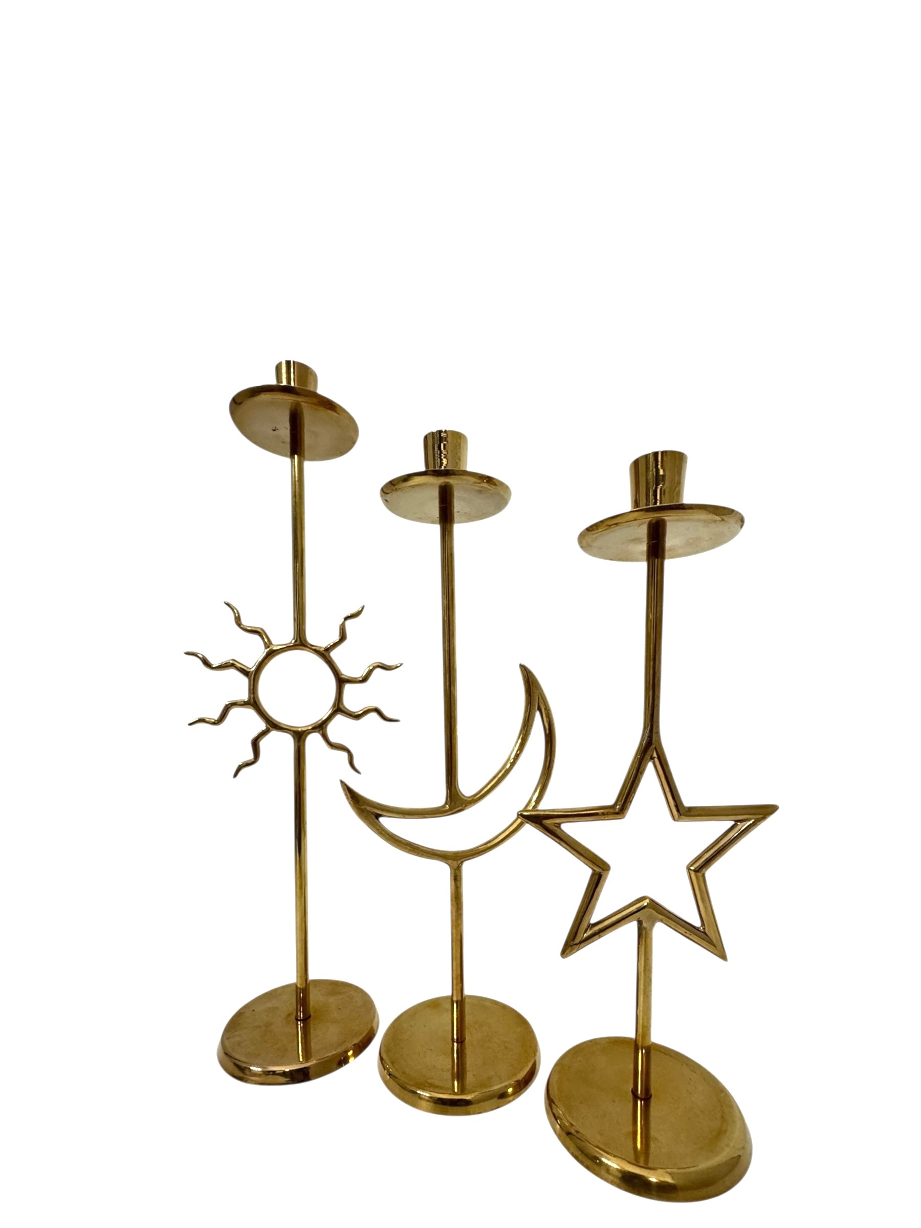 Vintage Brass Sun, Moon & Star Candlestick Trio – Celestial Mid-Century Modern Candle Holders