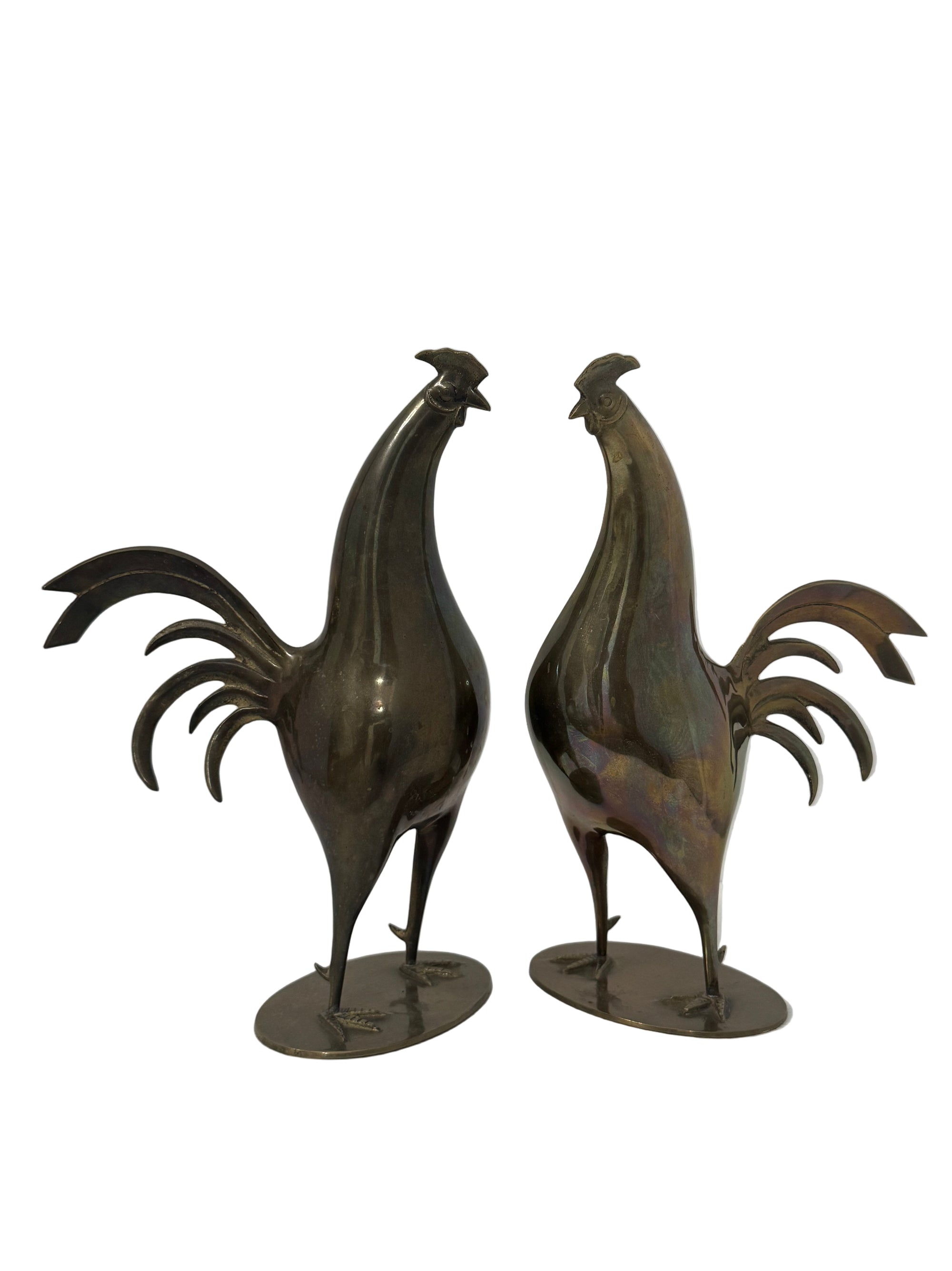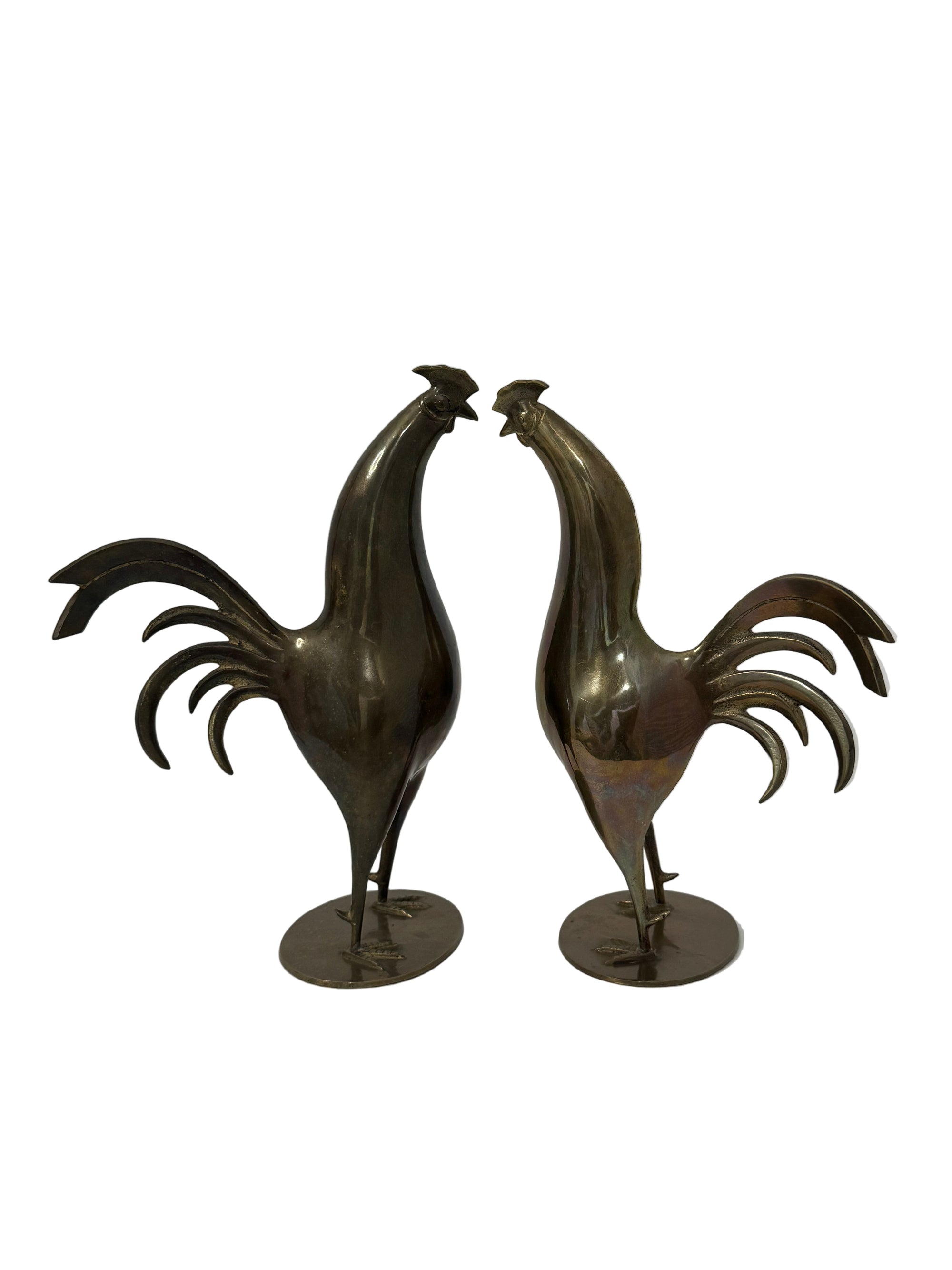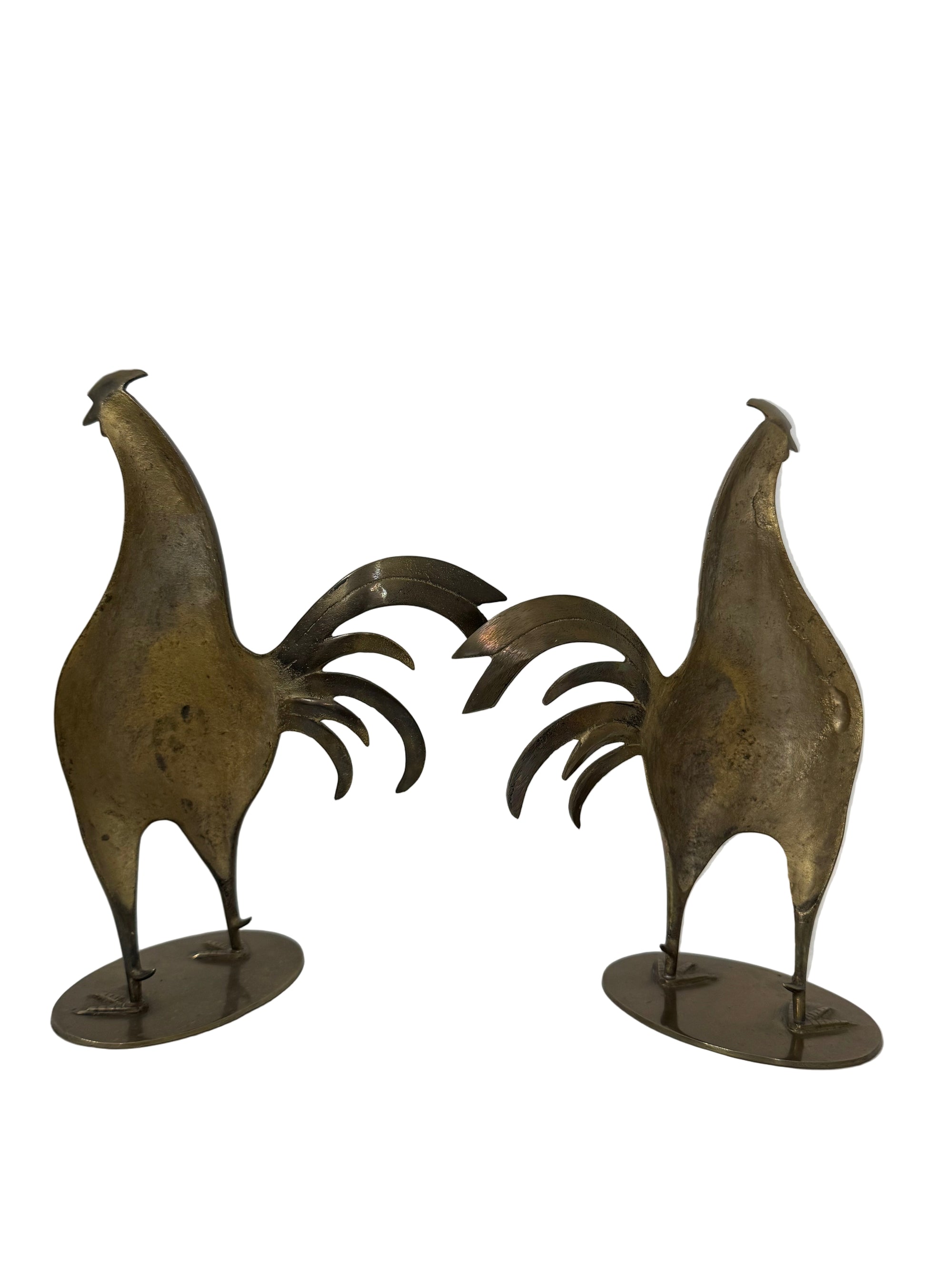 Vintage Mid-Century Modern Brass Rooster Sculptures – Pair, Made in Hong Kong