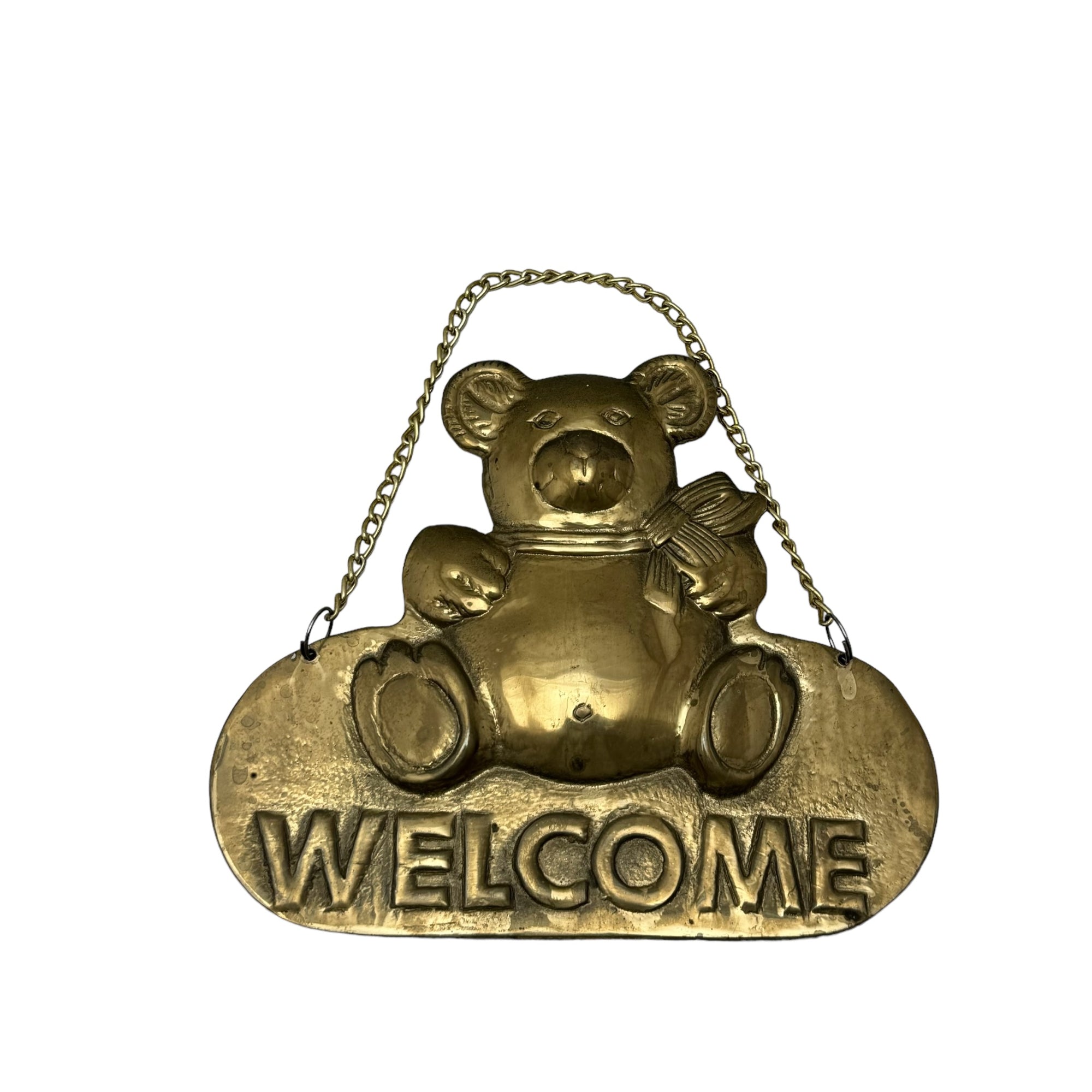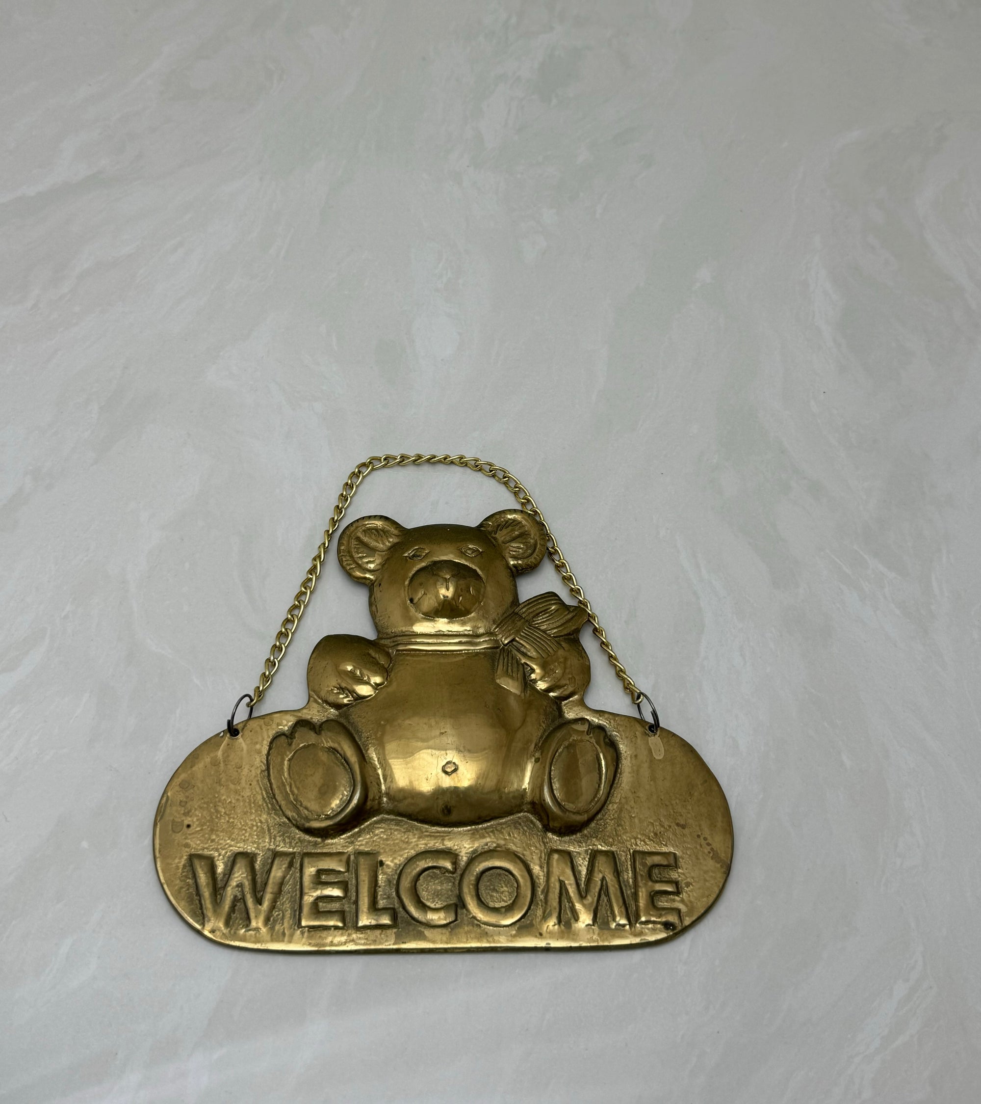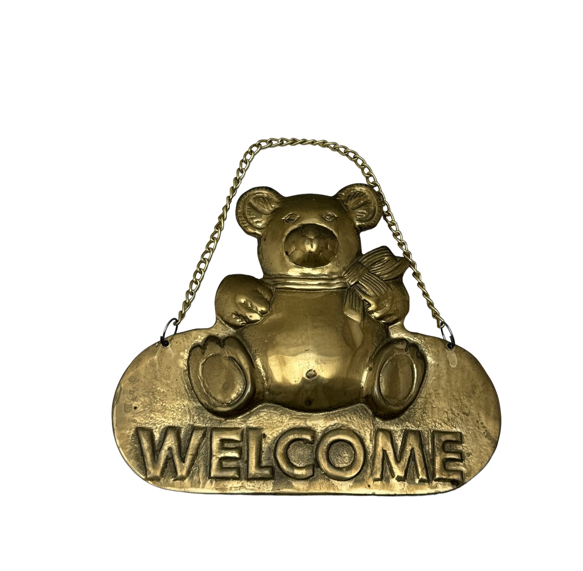 Vintage Brass Teddy Bear Hanging Welcome Sign