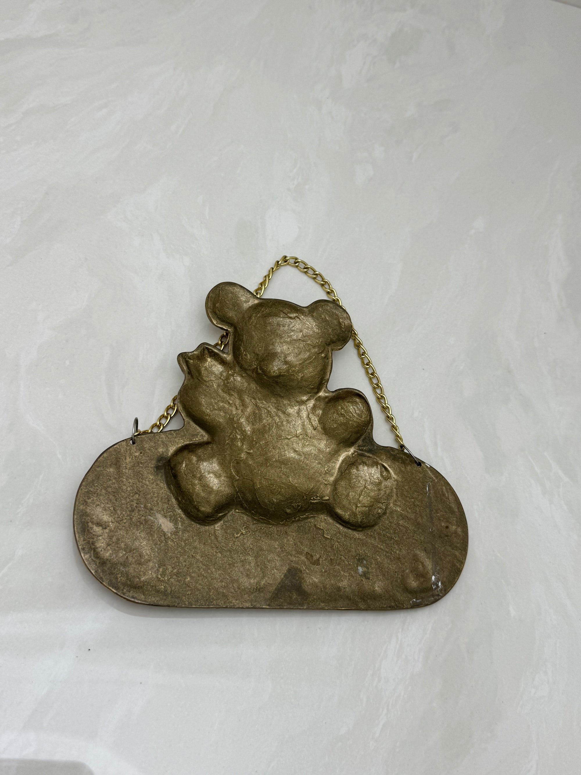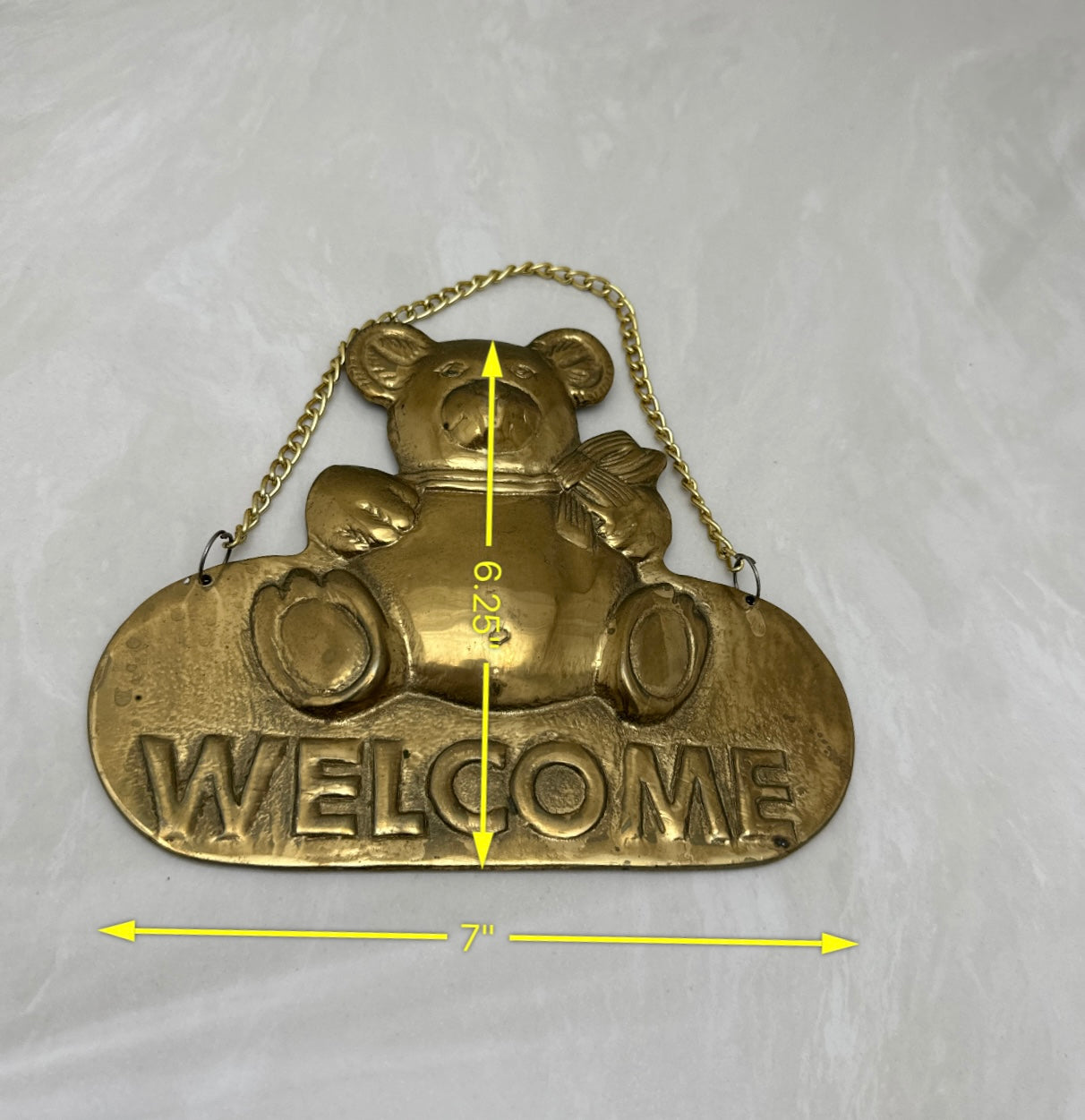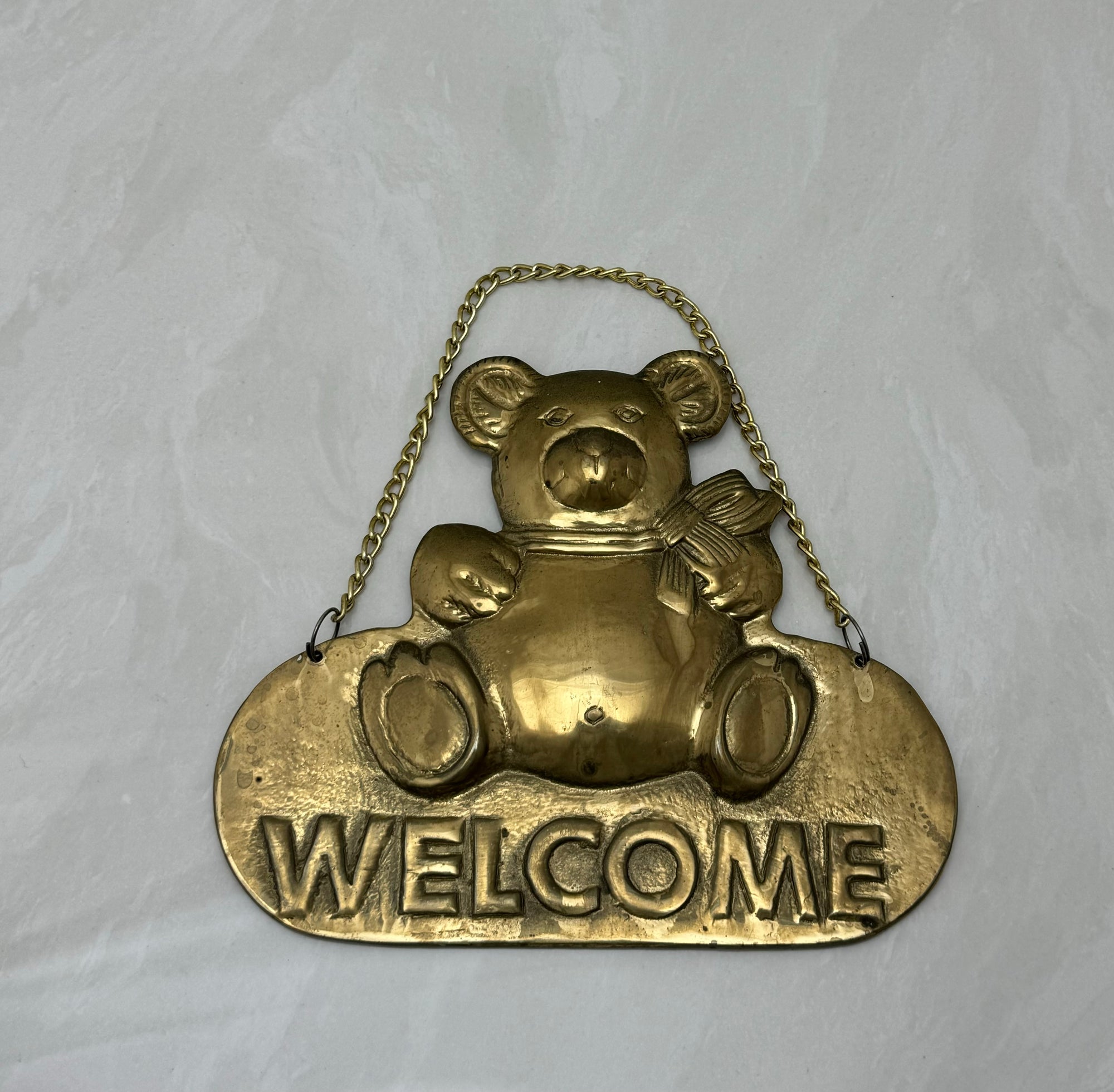 Vintage Brass Teddy Bear Hanging Welcome Sign