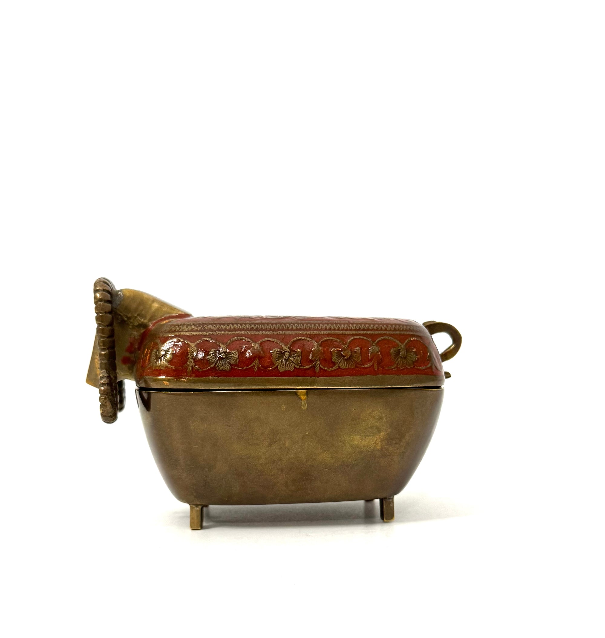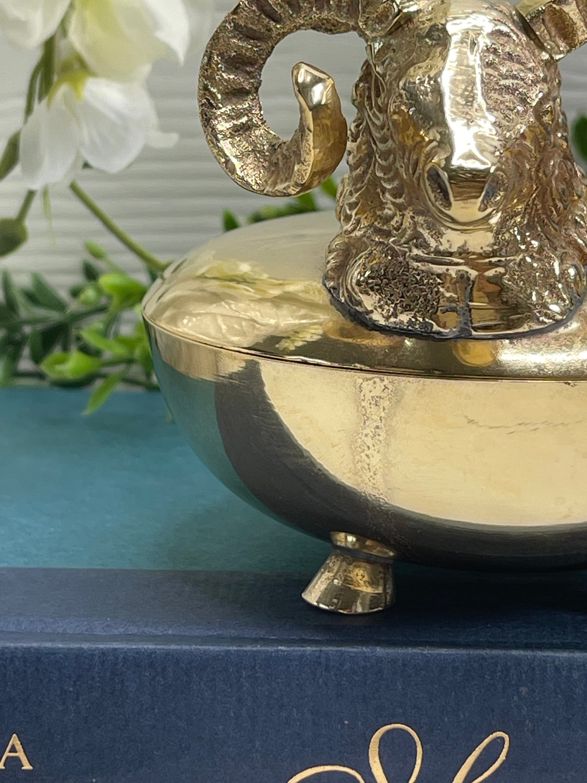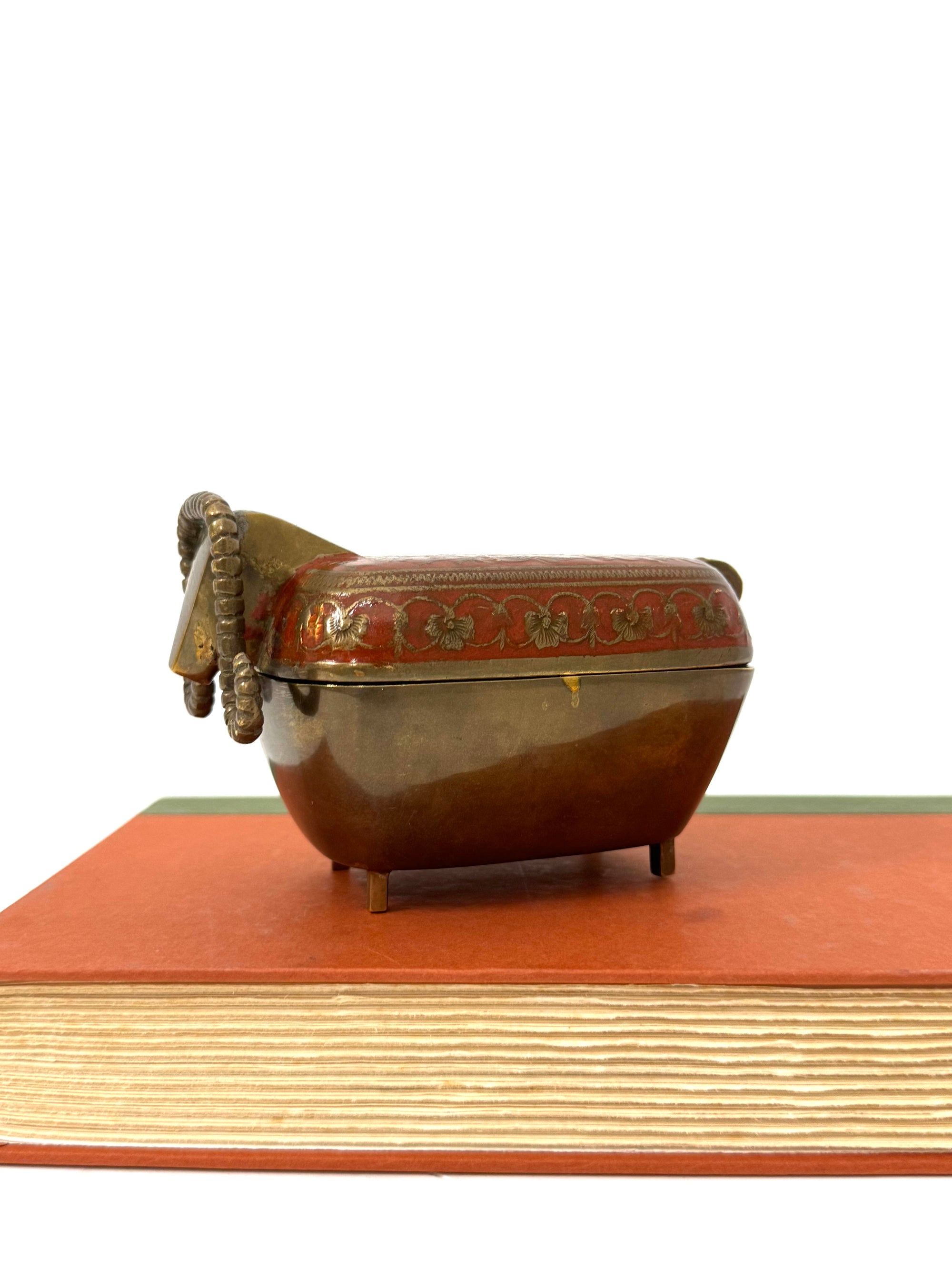 Vintage Brass Ram Trinket Box with Red Floral Enamel Lid | Mid-Century Decorative Storage Box