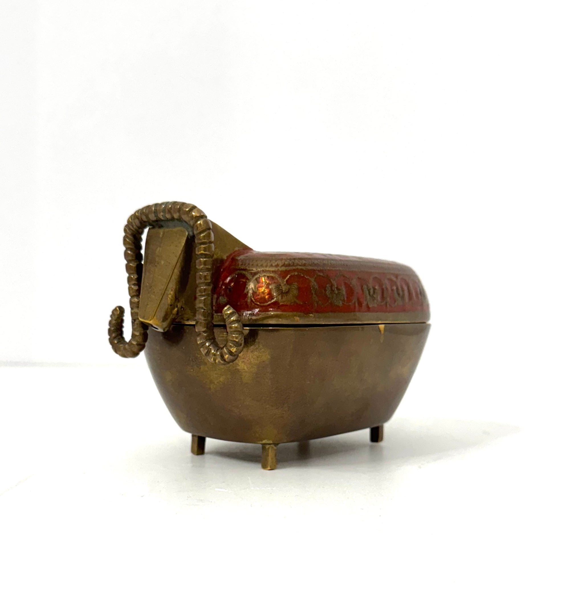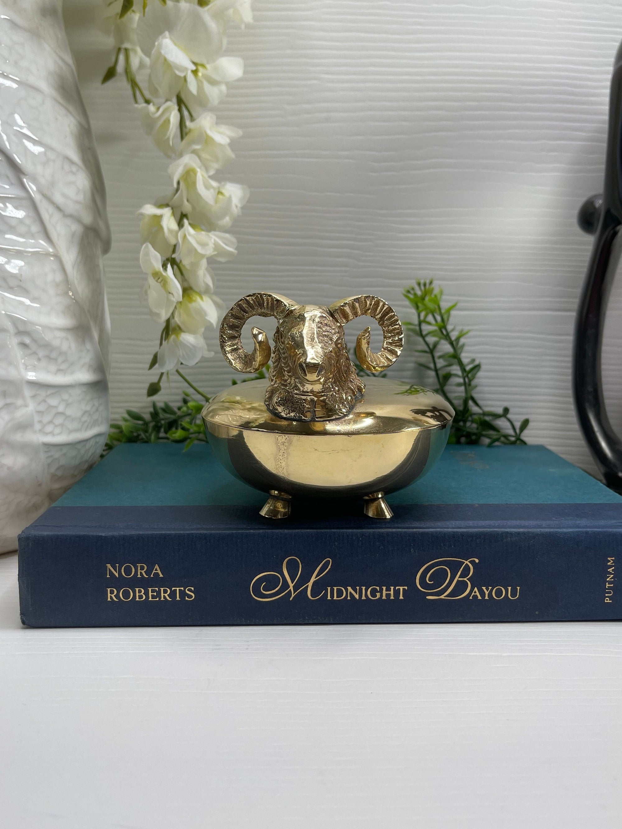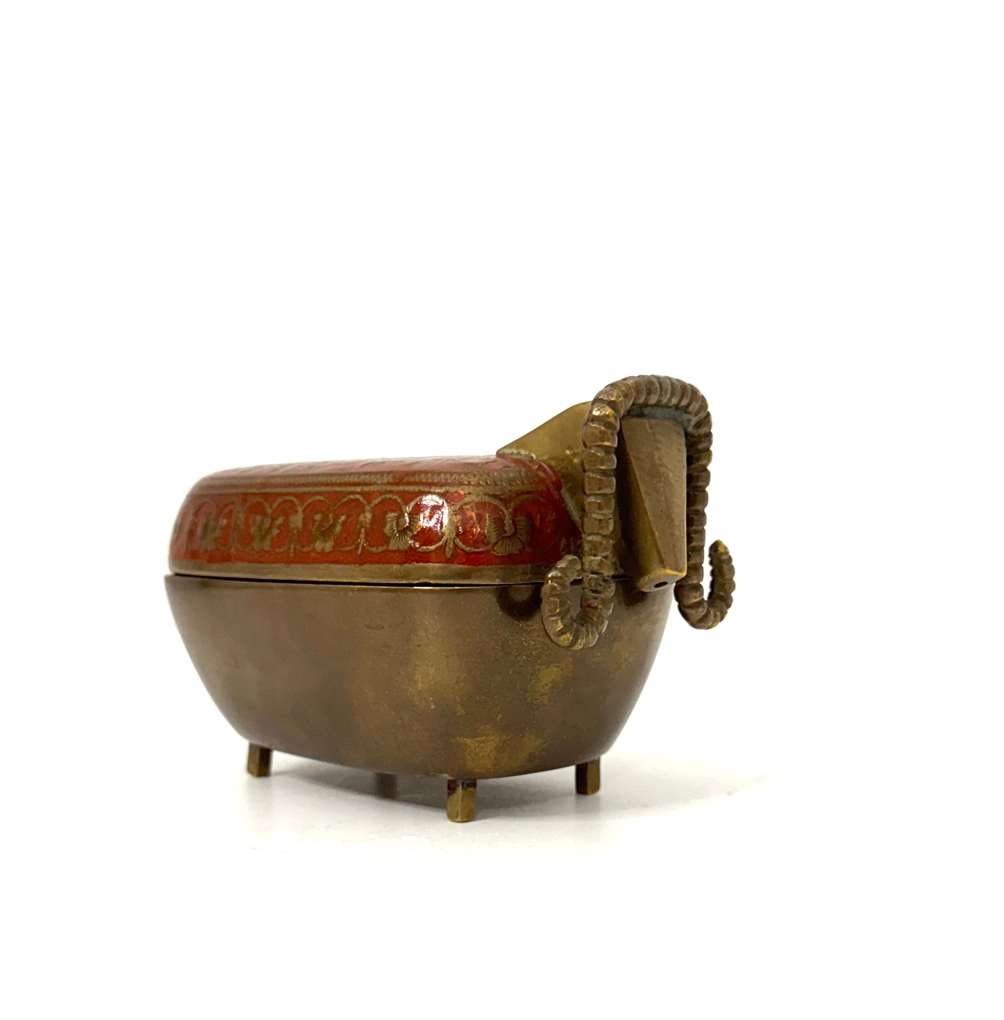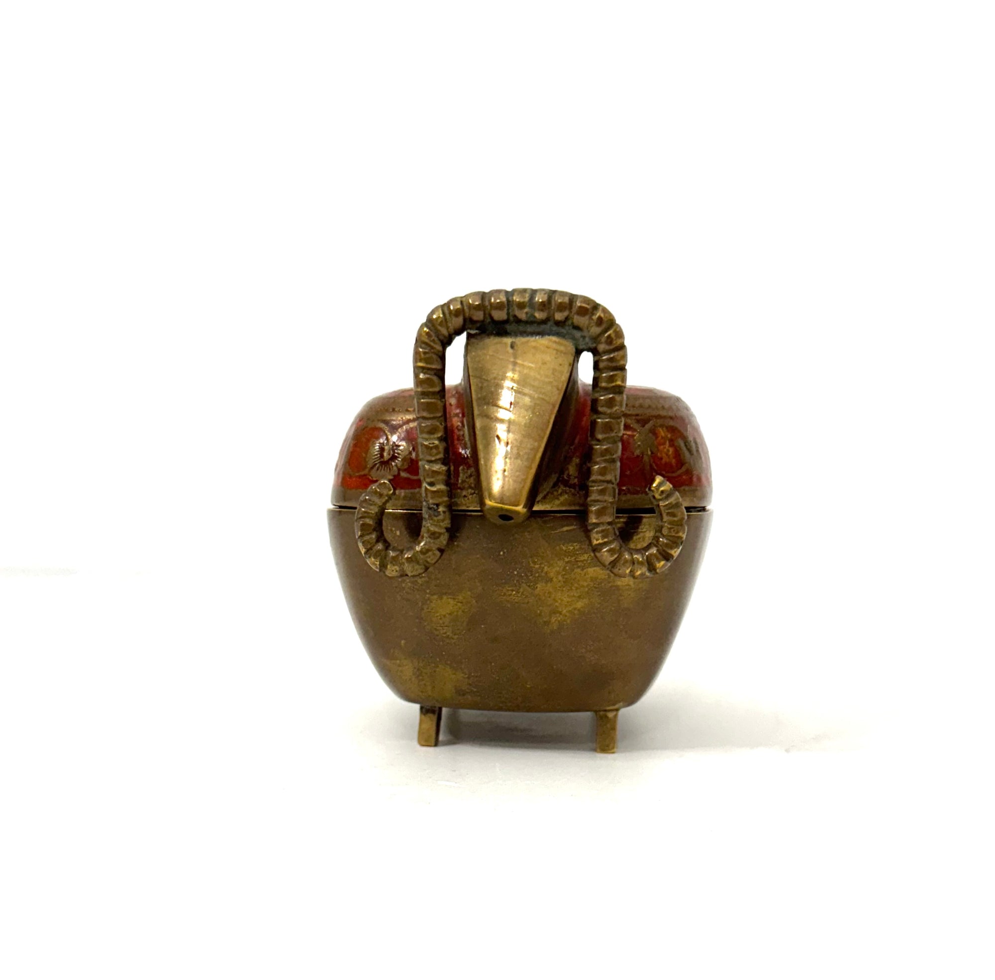 Vintage Brass Ram Trinket Box with Red Floral Enamel Lid | Mid-Century Decorative Storage Box
