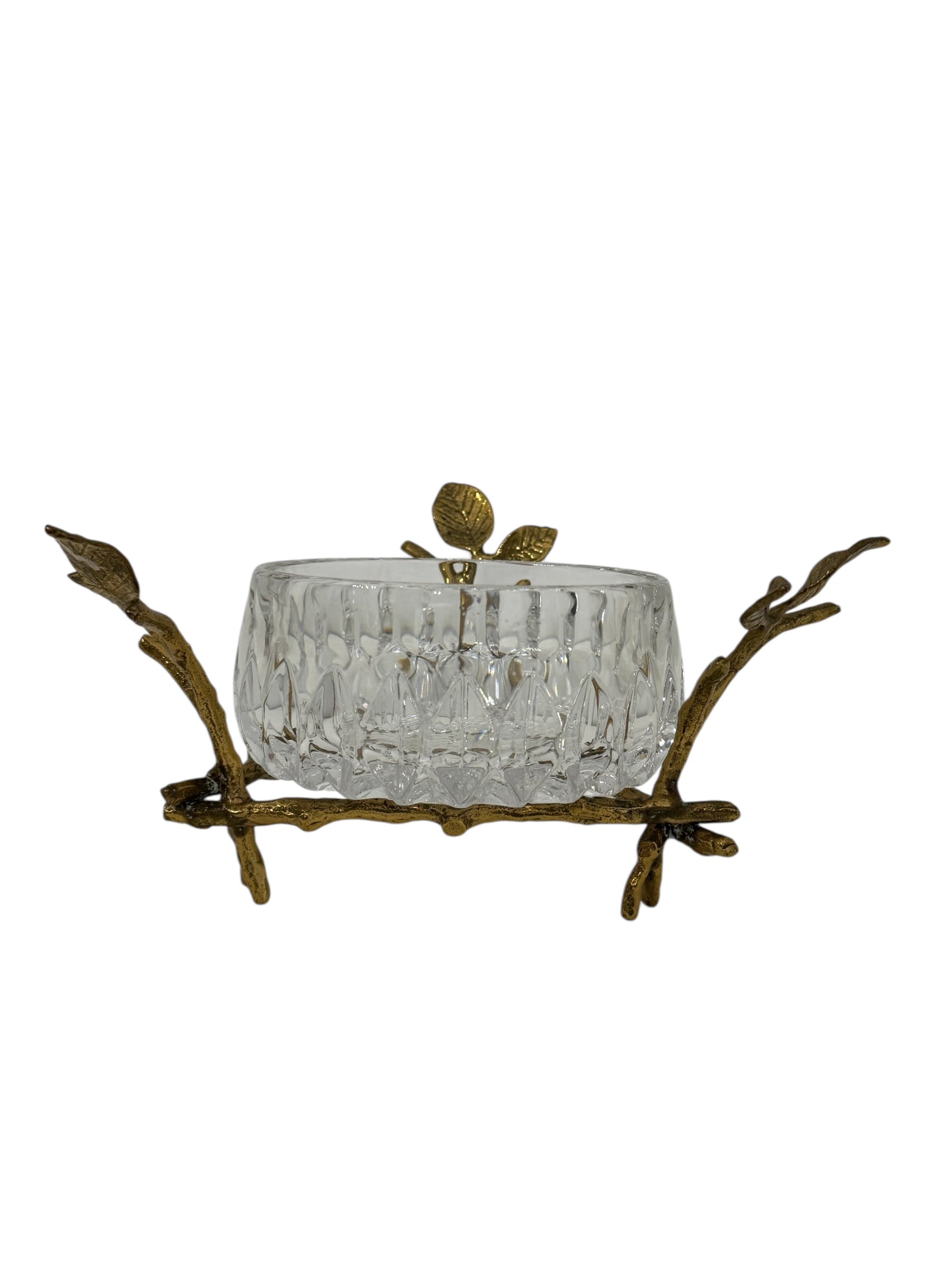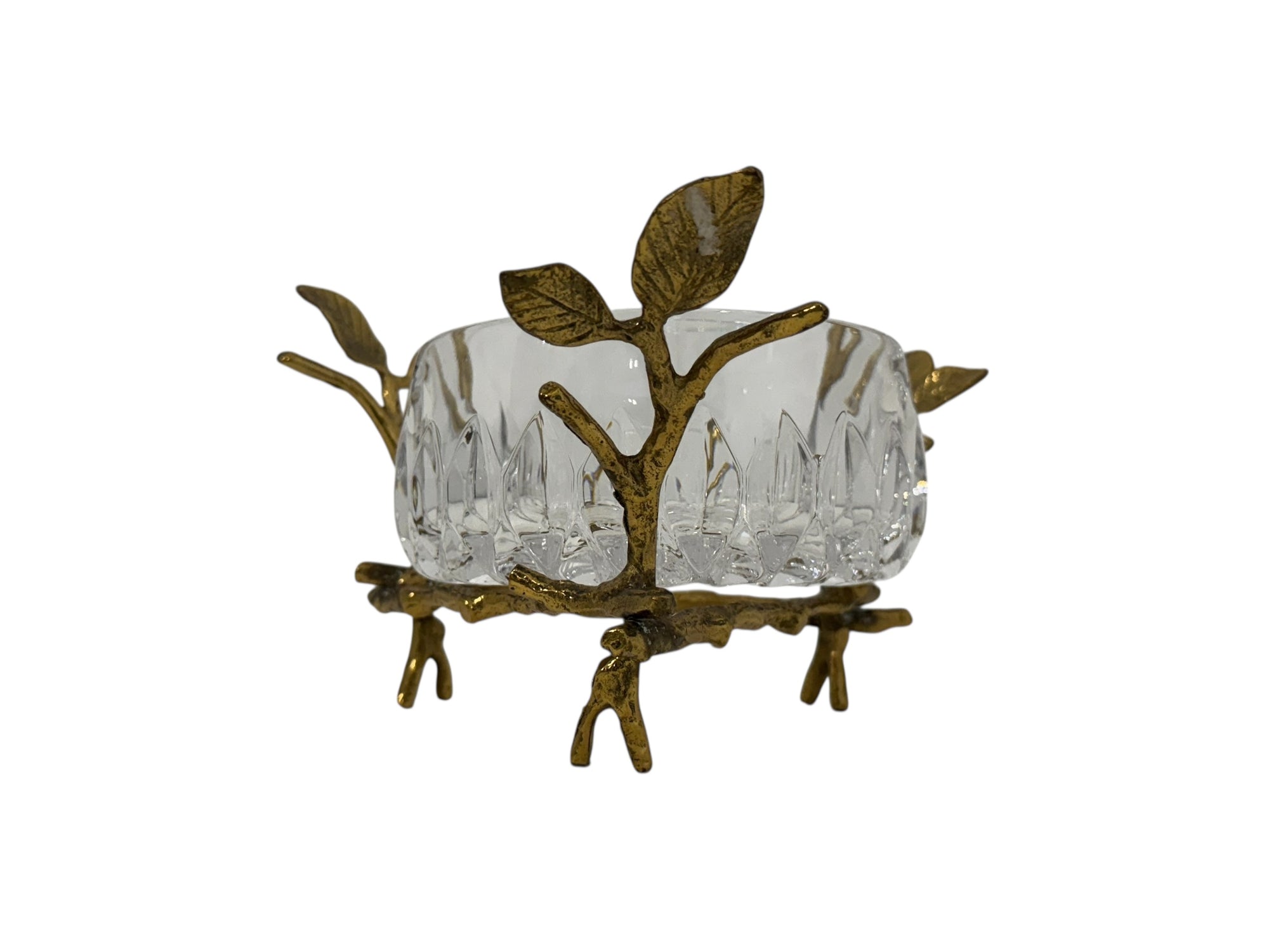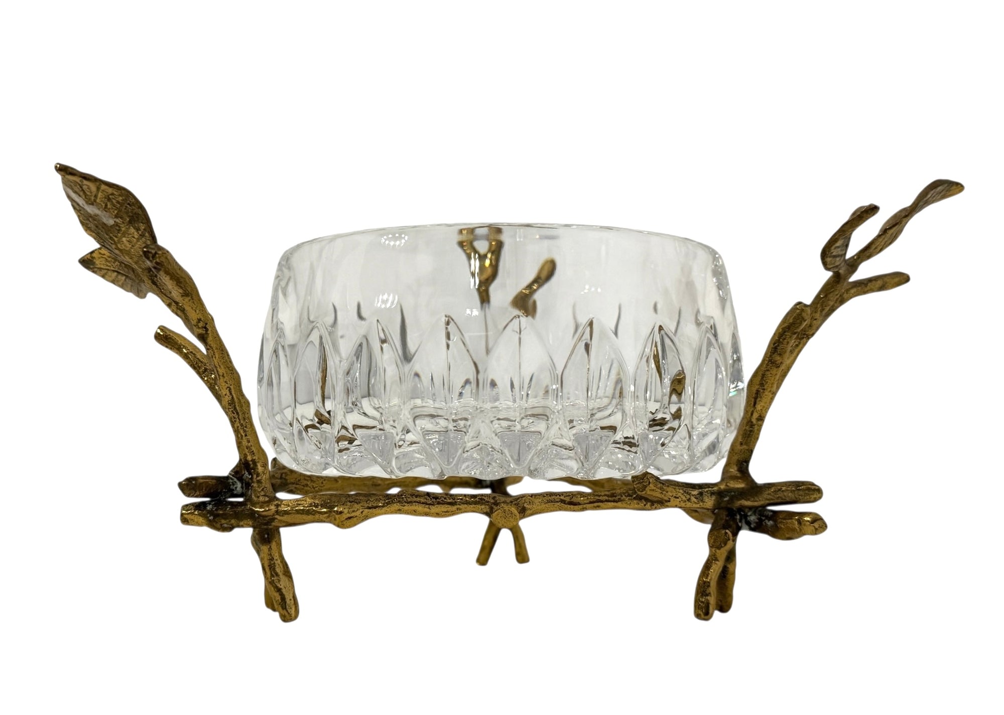 Vintage Cut Crystal Bowl with Ornate Brass Branch & Leaf Stand – Mid-Century Elegance