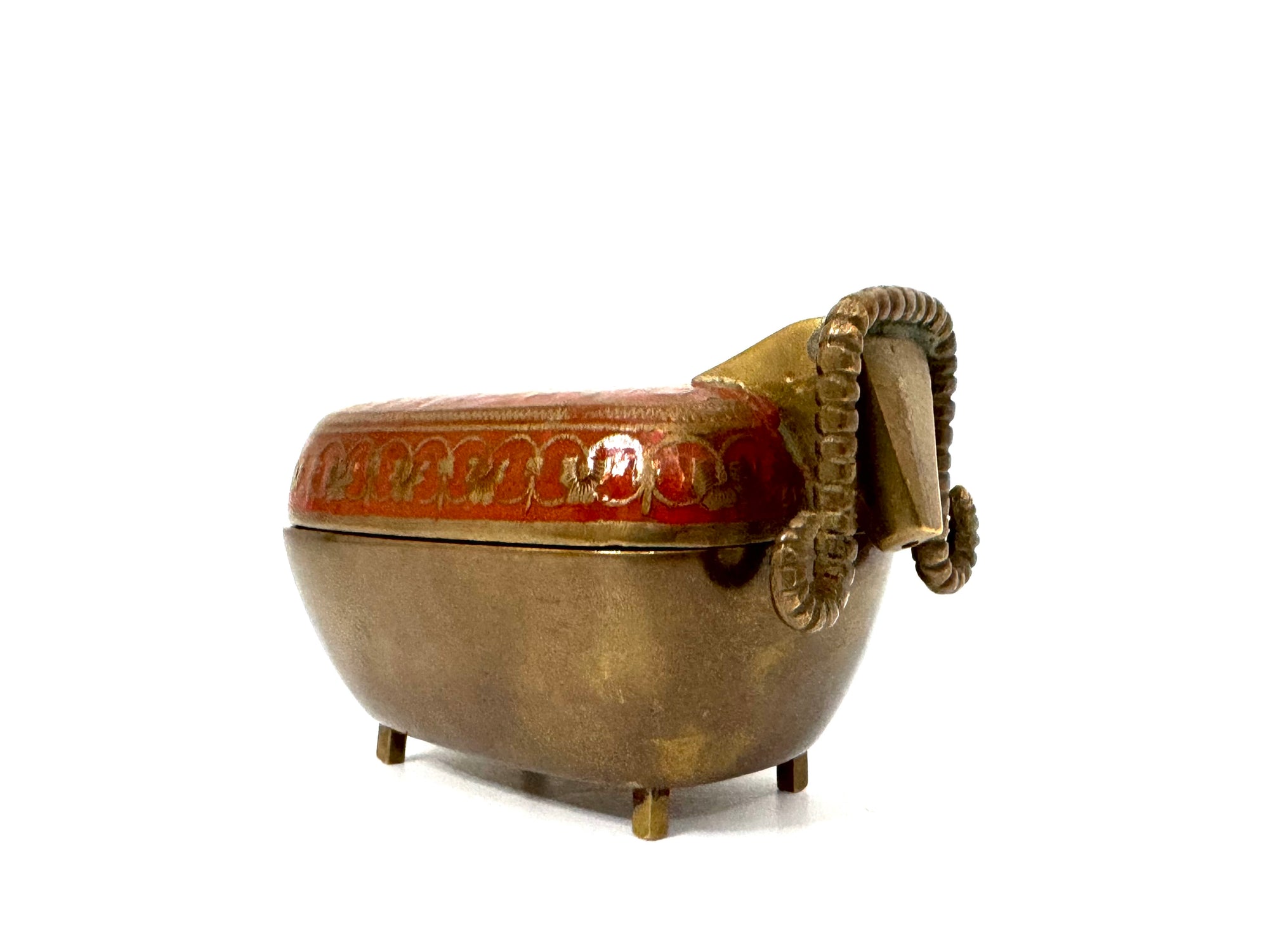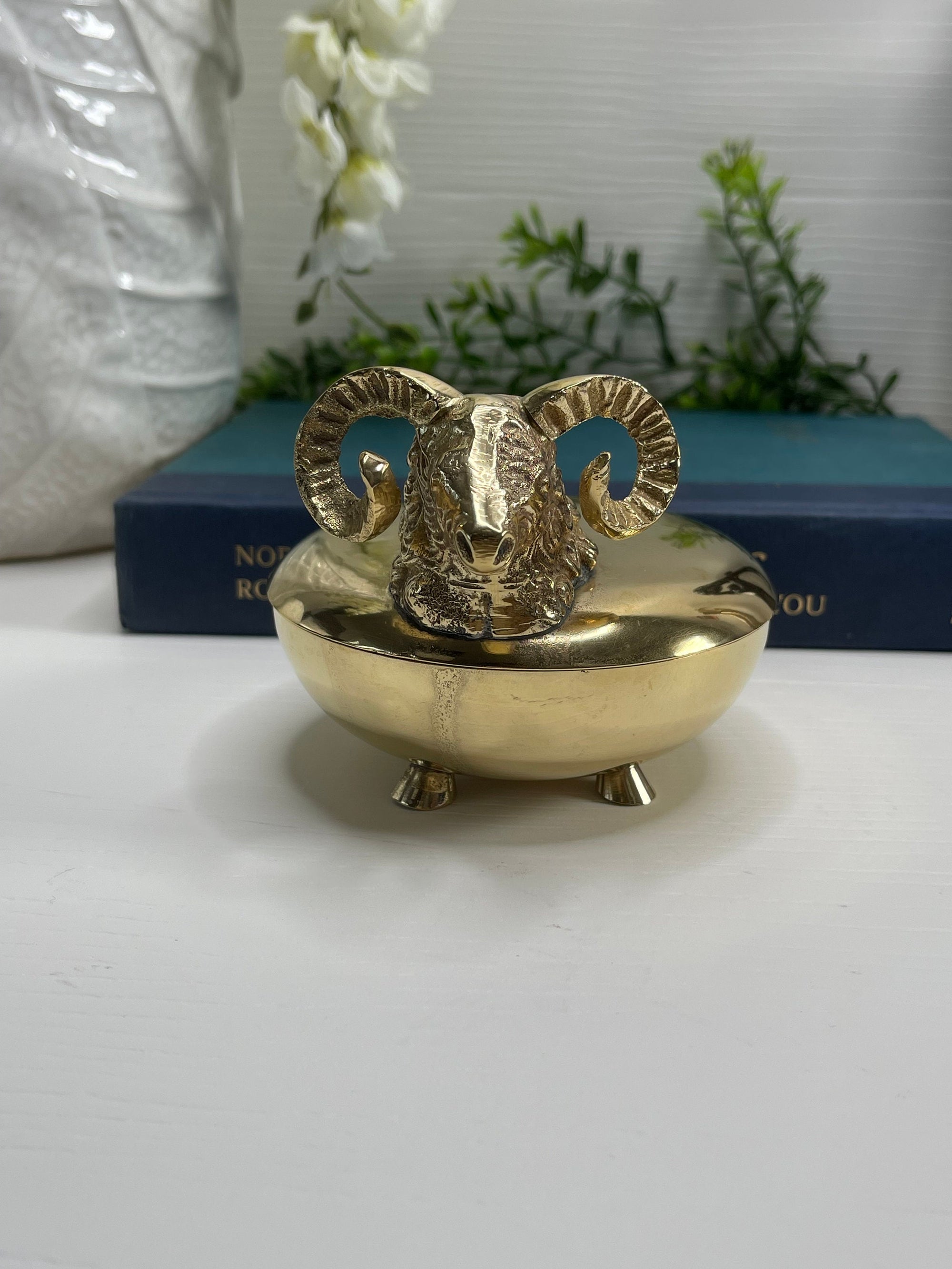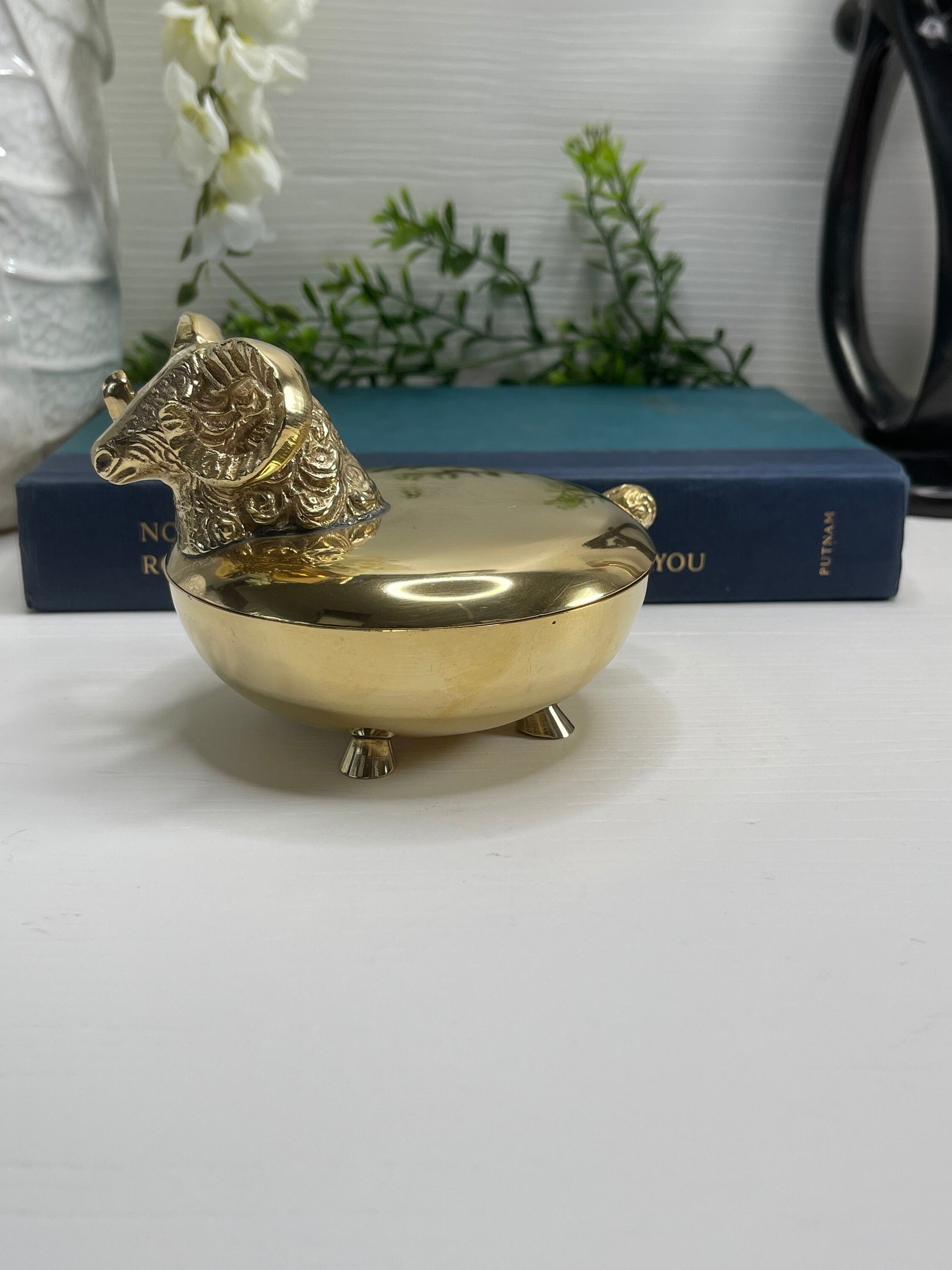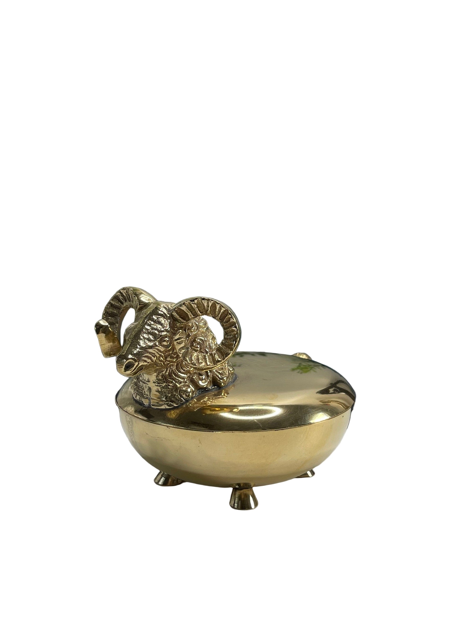 Vintage Brass Goat Trinket Dish With Enameled Etchings
